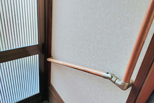 玄関付近の段差移動を安全にするため、握りやすい高さでL字に手すりを設置しました。