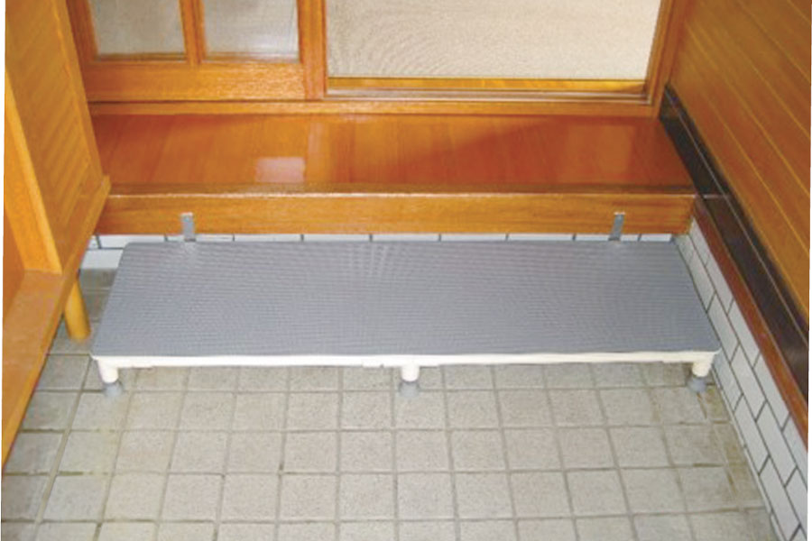 玄関での動作が安全に行えるように玄関の幅いっぱいに、天板面積の大きいステップ台を設置しました。