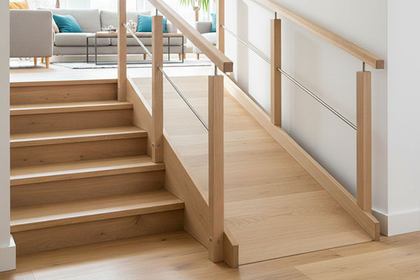 階段の傾斜に合わせて連続した手すりを設置し、日常の昇降をサポートします。
